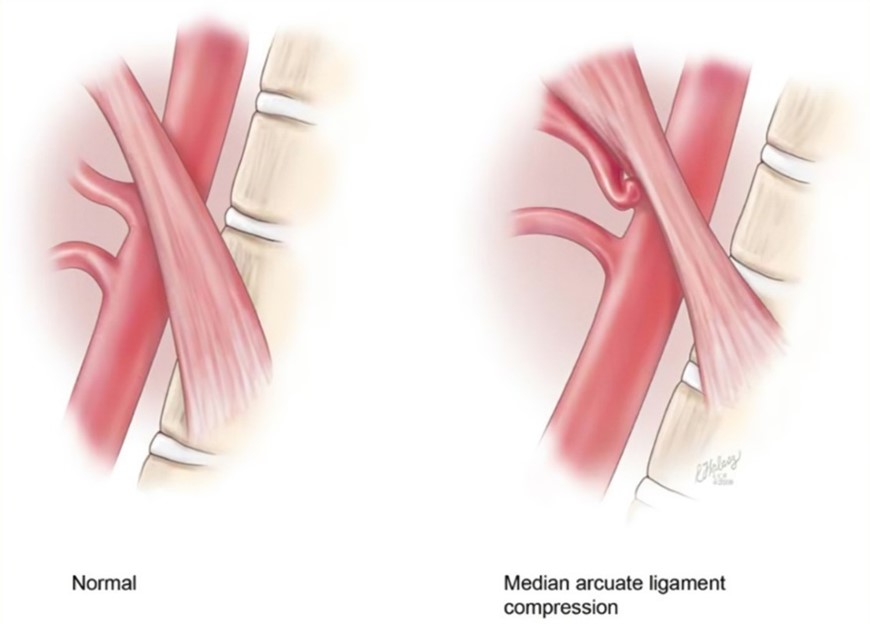 MALS, or Median Arcuate Ligament Syndrome, is one of the major abdominal vascular compression syndromes. It occurs when there is a low-lying diaphragm, and the median arcuate ligament, which is the band at the bottom of the diaphragm, sits too low on top of the celiac artery and its nerves. This is an anatomical abnormality that people are born with or obtain from trauma to the abdomen. The celiac artery and the celiac plexus nerves supply blood flow and sensation to stomach, spleen, liver, pancreas, and other major organs in the upper GI system. When the artery and nerves are compressed, as in the case of MALS, blood flow and sensation to these organs are compromised which leads to many life-altering symptoms.