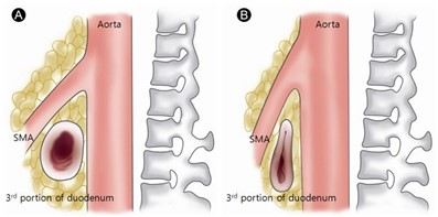 SMAS, or Superior Mesenteric Artery Syndrome, is another one of the major abdominal vascular compression syndromes. SMAS occurs when the fat pad surrounding the superior mesenteric artery is lost, causing the artery to compress part of the small intestine, called the duodenum. This then causes a compression of the intestine and prevents food and drink from passing through as they should. SMAS is most often caused by major, rapid weight loss from abdominal surgery, illness, or other abdominal vascular compressions.