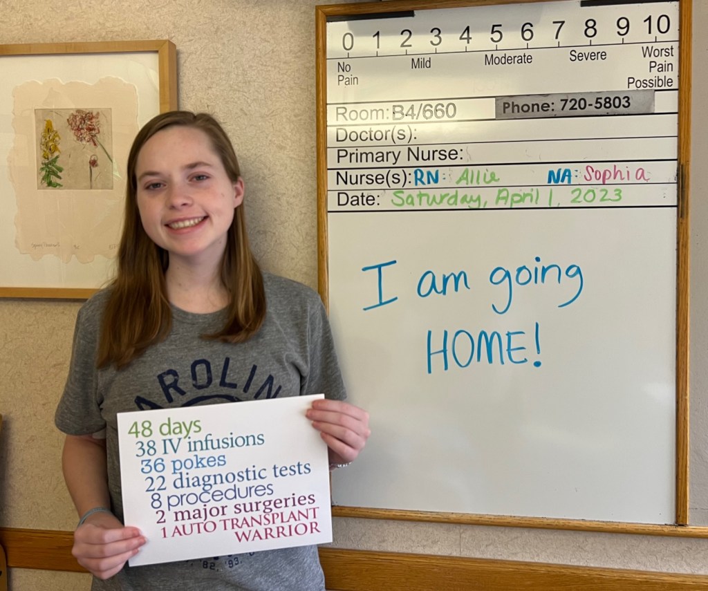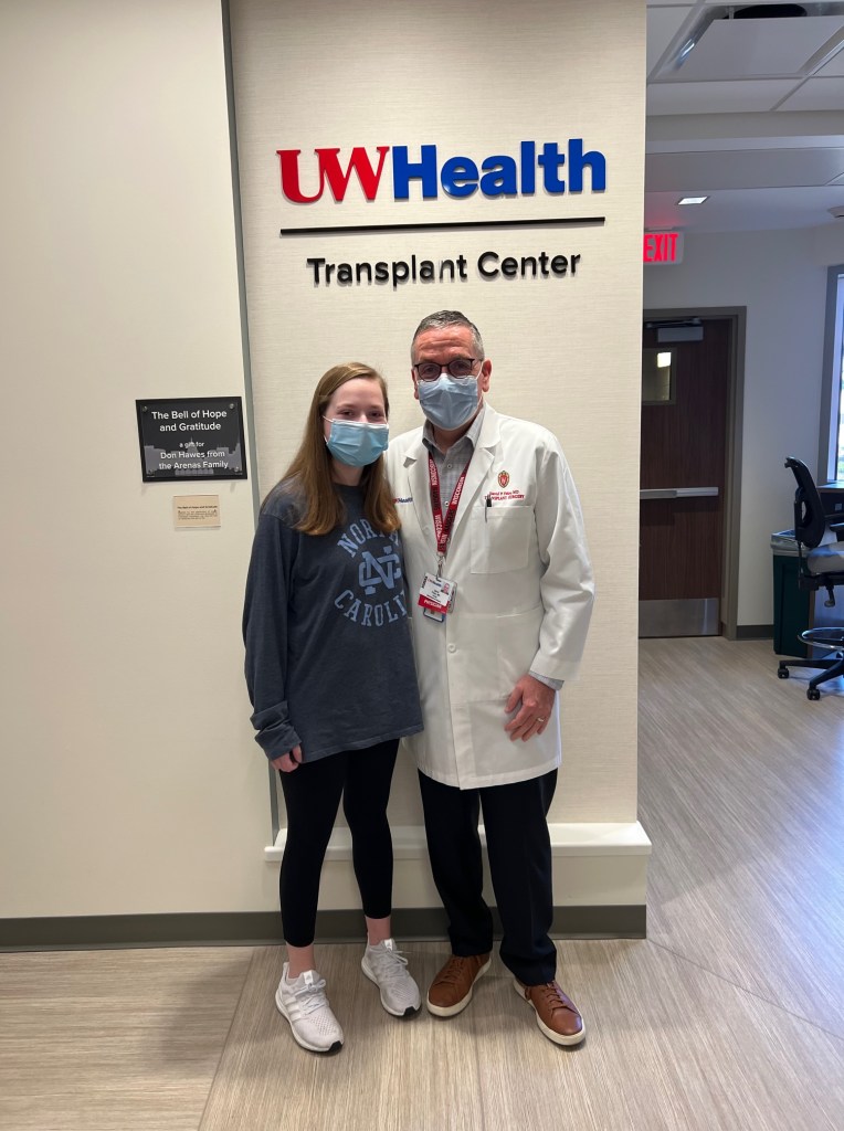 On April 12th, I had my post op appointment. They checked my scar and my bloodwork and along with how well I was feeling, I was given the all clear to come home! I then got to go down the hall and ring the bell celebrating all that I had gone through. I took pictures with my surgeon, the transplant fellow, and the transplant coordinators. They had all been so amazing and there was no team I would have trusted more to take care of me. My mom and I also snuck up to the transplant unit to say a final goodbye to the nurses and NA’s that were working that day. They all came to give me a hug, even the front desk worker. I had formed such a special relationship with them all. They had seen and taken care of me at my worst and had gotten me through it all.