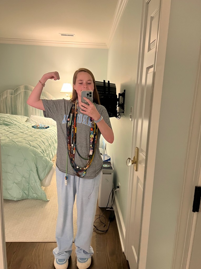 That week I also had my 8th endoscopy to check my stomach and get pyloric botox, which is where my doctor uses botox in my pyloric sphincter to help relax my stomach to help with nausea. My GI saw that my stomach was very red and inflamed but hoped that medication would help. After my endoscopy I got to see my favorite PACU nurse and share the news that I was finally feeling much better. She always teases me about being a UNC fan and always makes me smile. I also got to get my Beads of Courage that I had earned in Wisconsin. Each color and type of bead represents something different that I have gone through. For example, a black bead is a poke, a yellow bead is a night in the hospital, and a green bead is a diagnostic test. I earned 274 beads in Wisconsin, which added 10 feet to my strand! In total, I have over 900 beads and 31.5 feet that I have earned since September 2021.